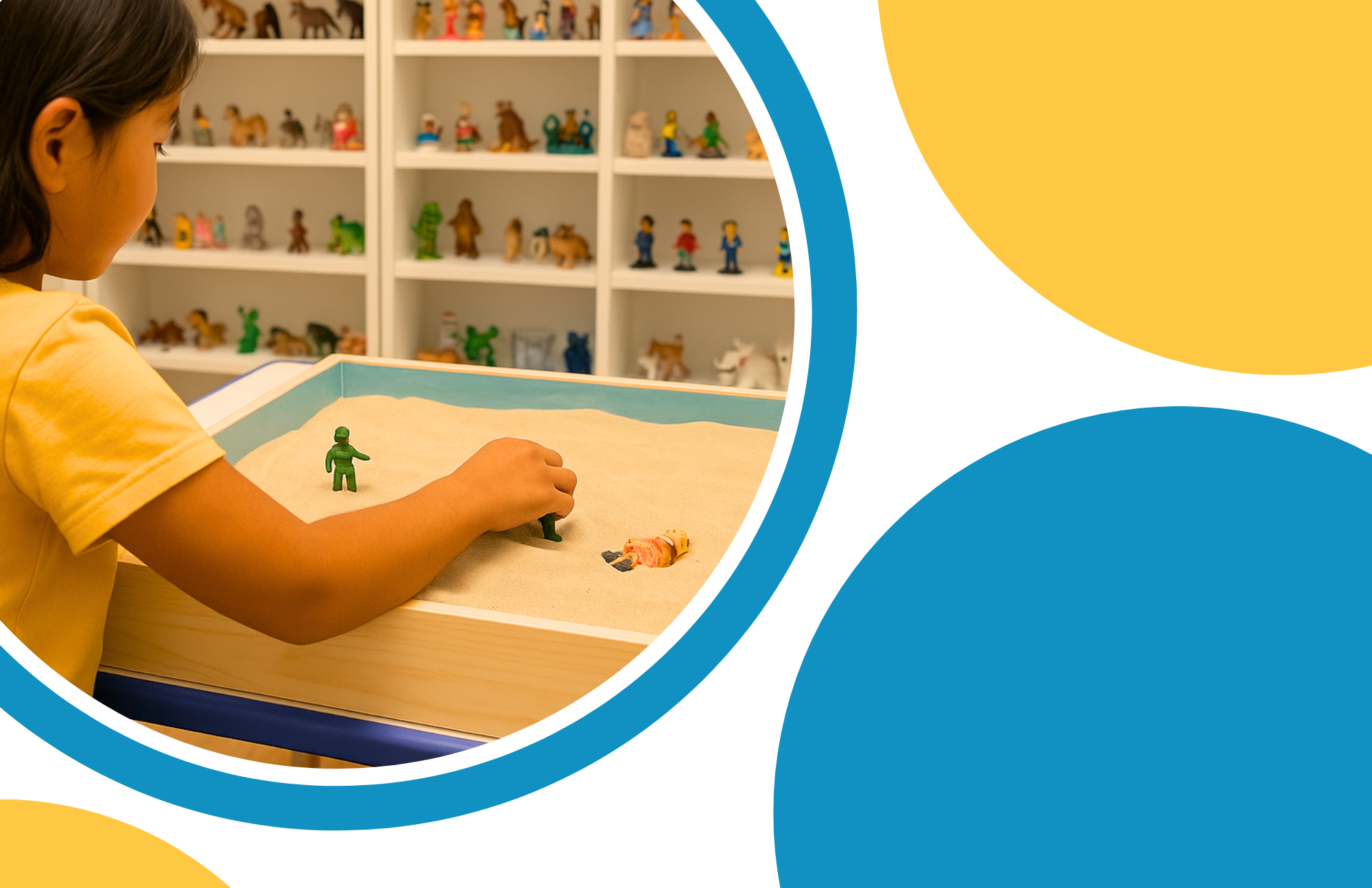 In our sand tray room, play becomes a pathway to healing. When Sofia first came to us, she didn’t have the words for the worry she carried. She quietly buried small figures deep in the sand, a reflection of the feelings she kept inside. Week by week, she uncovered them and began to create new stories. Her worlds grew brighter, and she did too.
