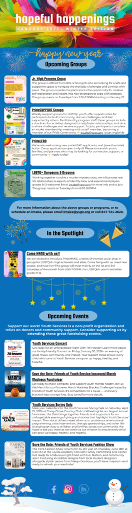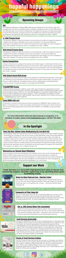 The Youth Services newsletter provides our agency partners and clients the latest information about new or existing therapy groups, upcoming fundraising or community events, and any seminars or presentations in which Youth Services has participated in or provided.