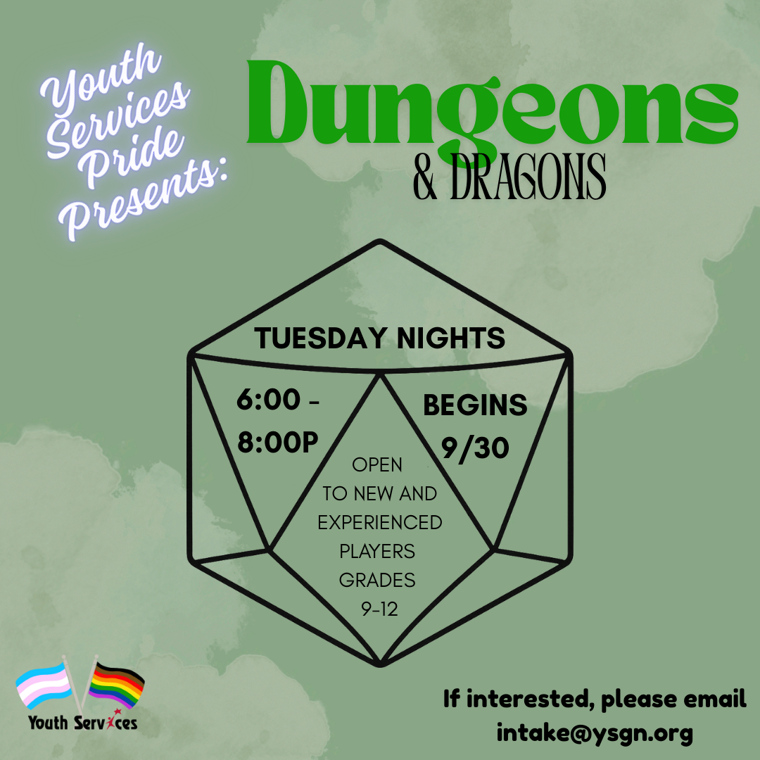 LGBTQ+ Dungeons & Dragons Campaign begins September 30th! Working together to solve a murder mystery story, we will process real life relationships & aspects of identity. New and experienced players grades 9-12 welcome! Email intake@ysgn.org for more info and to join.