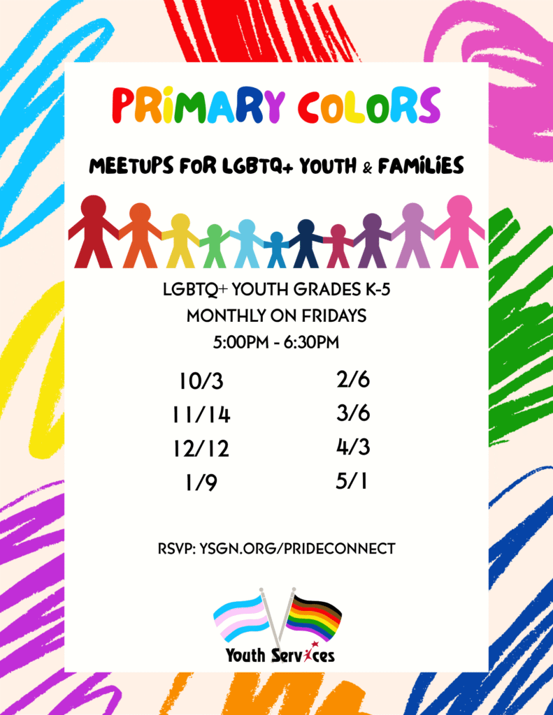 LGBTQ+ youth grades K-4 and their families are invited to join us for a Primary Colors meetup! Build community and make new friends with other LGBTQ+ youth and families at Youth Services for a night of fun and activities for queer and trans/gender expansive youth. This event will take place at Youth Services on Friday, 2/28 from 5PM to 6:30PM.