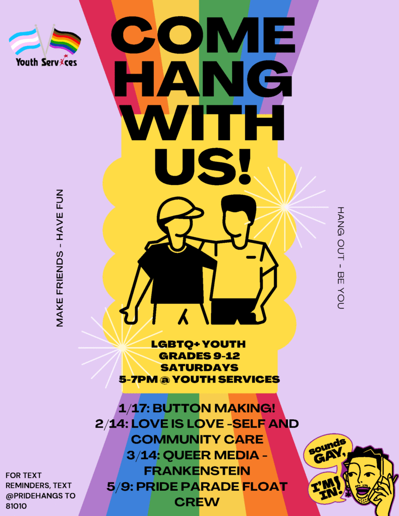 prideHANG is a series of themed social drop-in groups for LGBTQIA+ high schoolers and allies. Come hang with us, meet new people, and have fun! For more information and to receive reminders of prideHANG events, text @pridehangs to 81010